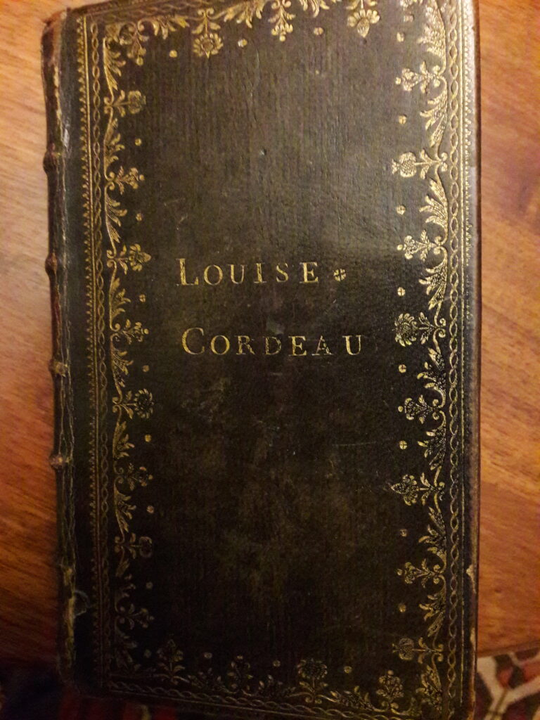 La mariée est du nord de la Loire, elle à connu la Révolution, elle est attachée à la Royauté et à l’Eglise. Elle a dans ces bagages son livre de messe intitulé « Heures Nouvelles dédiées à la Reine ». Elle l’a caché bien soigneusement pendant cette période trouble, son nom de jeune fille « Cordeau » est gravé sur la couverture arrière. C’est un beau livre.
