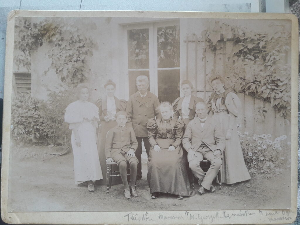 Théodore Maussion et son épouse Georgette Lemaistre entourés de leurs enfants (pierre à gauche assis) et de leur belle fille Maria Oger vers 1900. Louis Maussion (?) assis près de Georgette.