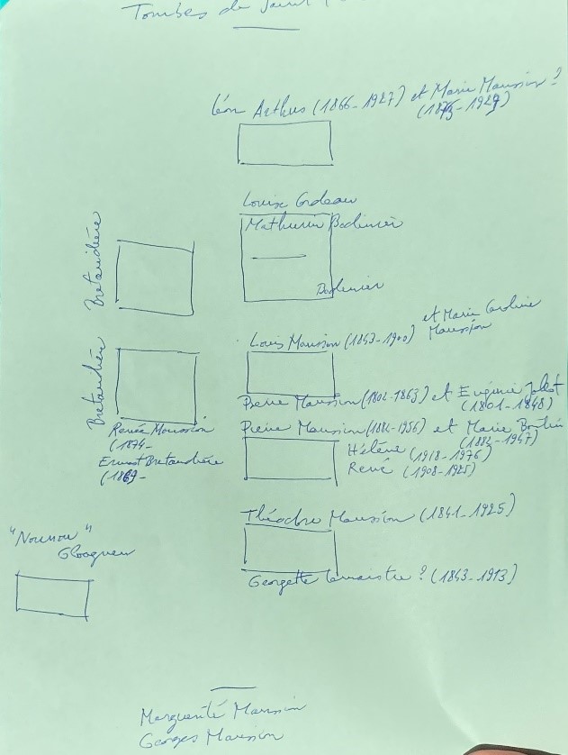 La progéniture de Pierre Maussion et Marie Boutin s’est égayée à quelques mètres de leurs parents : Marguerite et Paul Ballain dans l’allée principale, Jeanne et jacques Lemonnier dans l’allée des Bretaudière. Et à la génération suivante : Françoise Ballain et Loïc Le Lann (mes parents) contre le muret sud.